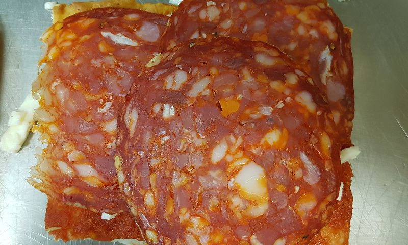 Trancio di pizza mozzarella pomodoro e salame piccante. Peso 150 gr. circa