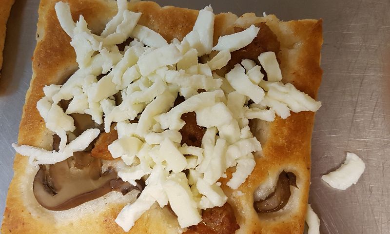 Trancio di pizza bianca, mozzarella, funghi e salsiccia. Peso 150 gr. circa